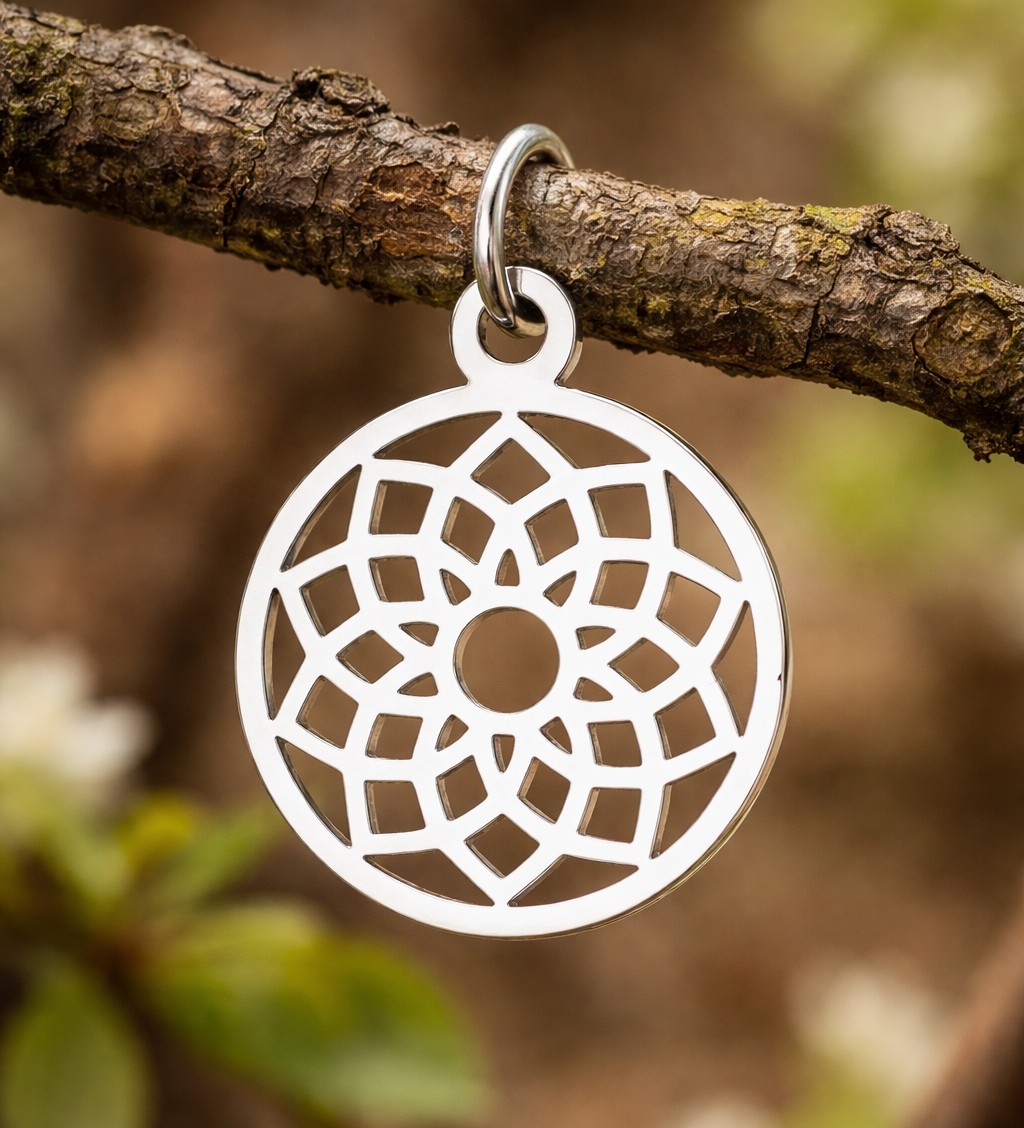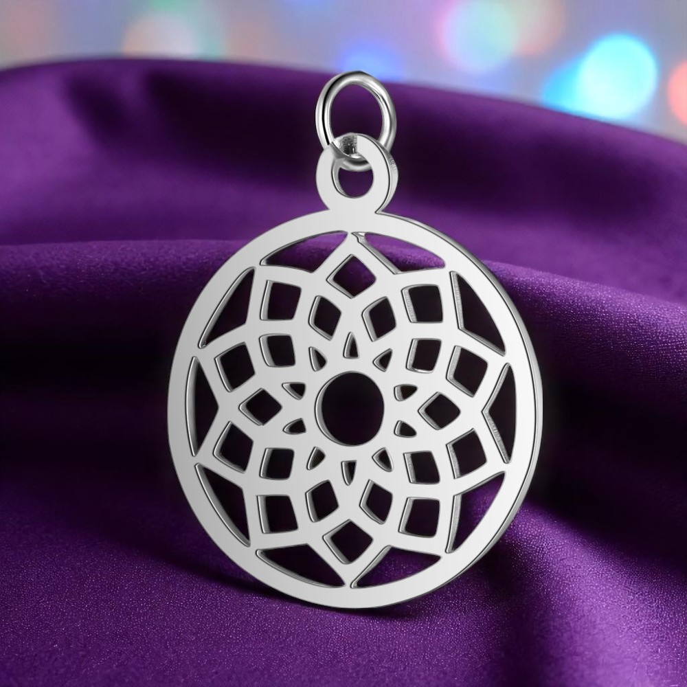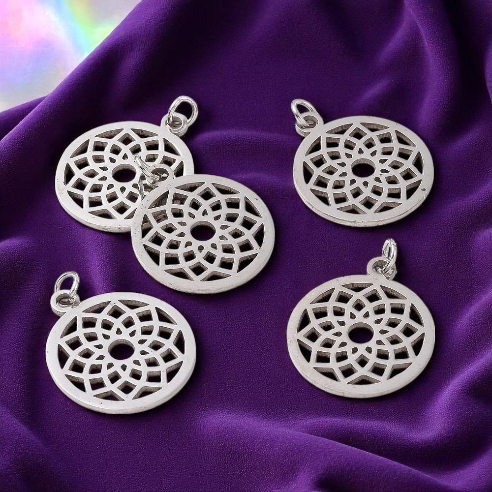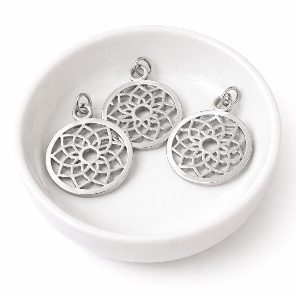 Edelstahl Chakra Anhänger rund platinfarben 22,5 x 19 x 1 mm - filigranes Mandala Design