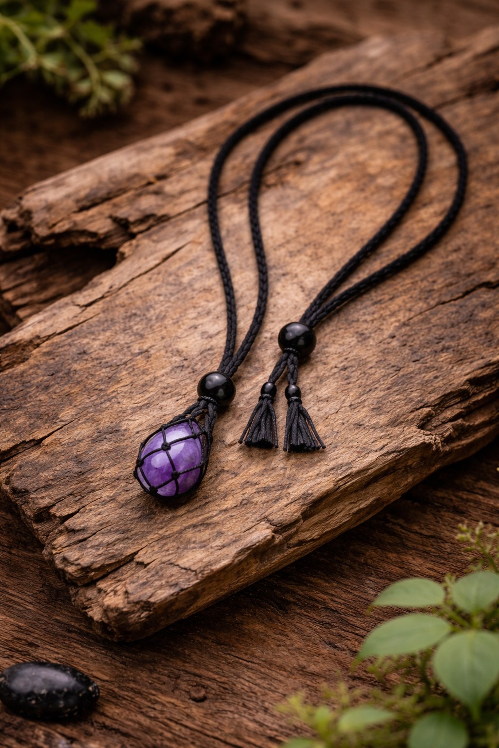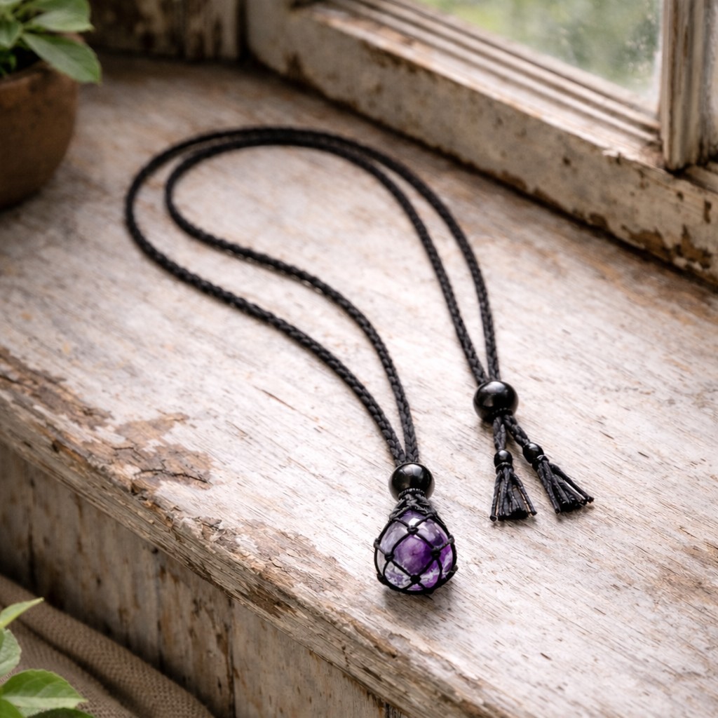.Diese handgefertigte Makramee-Kette trägt einen ausdrucksstarken Amethyst mit feinen weißen Adern - ein Naturstein der für innere Ruhe, Klarheit und spirituelle Tiefe steht. Sorfältig in schwarzes Makramee eingebettet, entfaltet der violette Sein seine sanfte, zugleich kraftvolle Ausstrahlung.