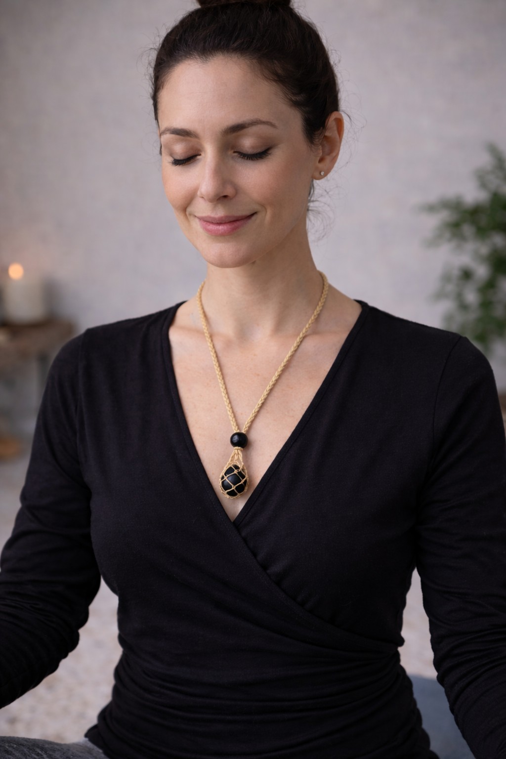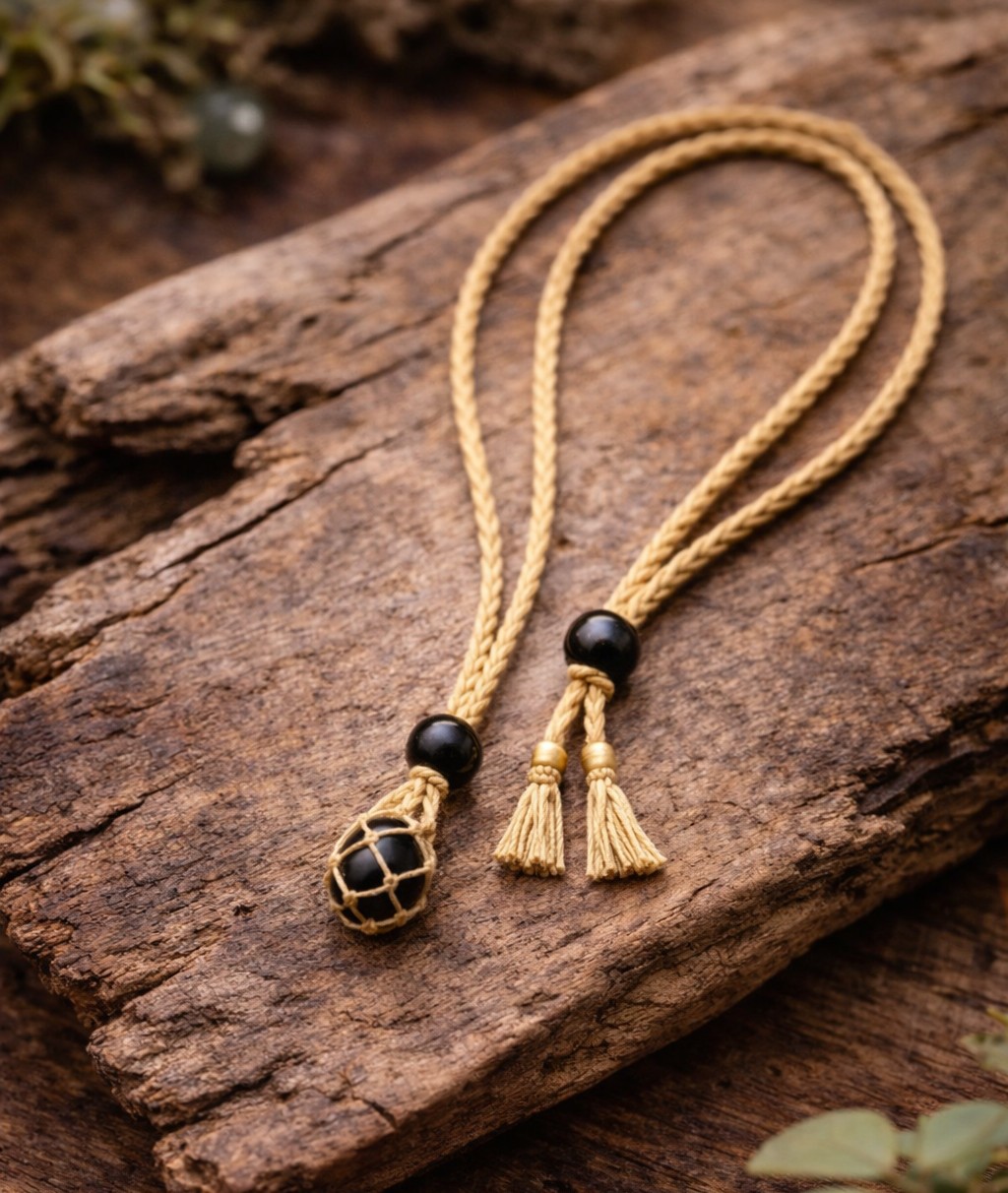 Diese handgeknüpfte Makramee Kette mit Obsidian ist mehr als nur Schmuck - sie ist ein kraftvoller Begleiter für deinen Alltag. Der tiefschwarze Obsidian liegt sicher in einem feinen Makramee-Netz und wird von einer verstellbaren Kordel getragen.