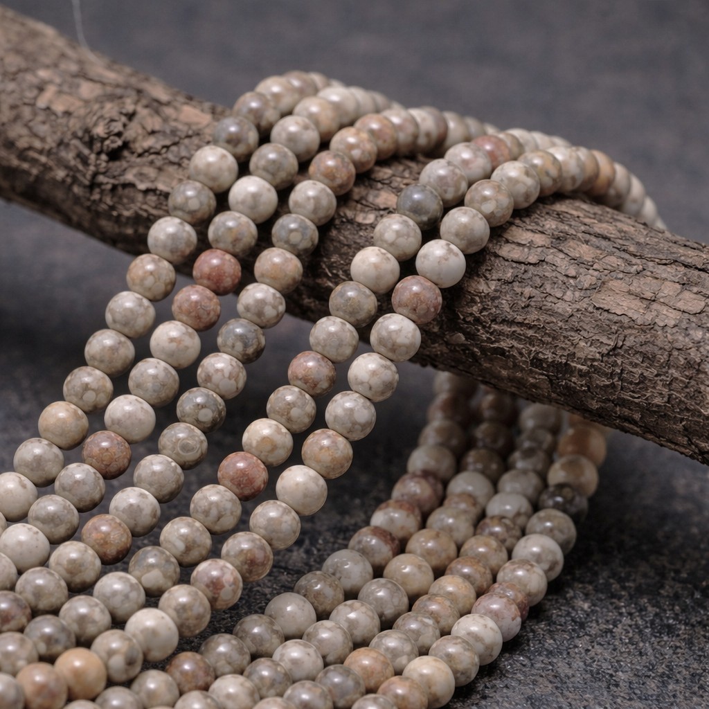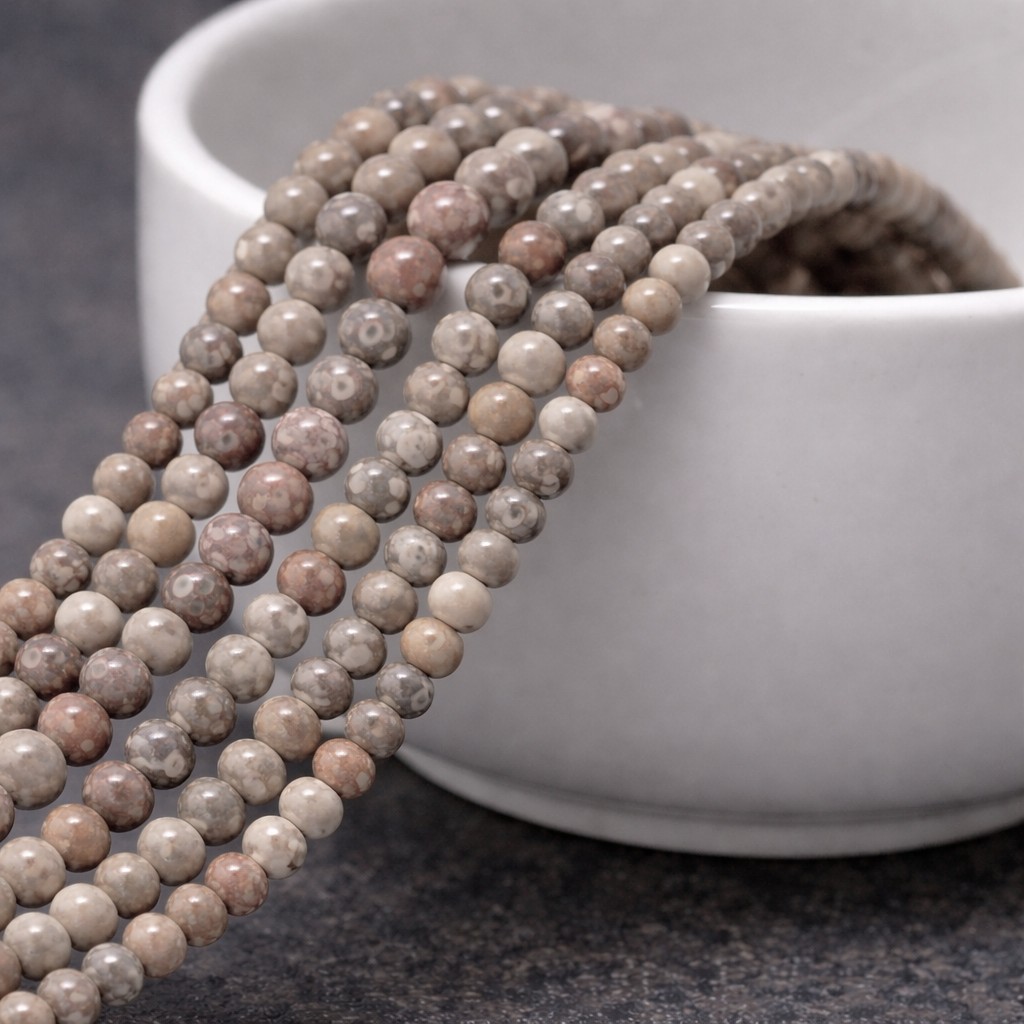 Dieser hochwertige Jaspis Perlenstrang überzeugt durch seine natürlichen Erd- und Cremetöne sowie die charakteristischen, organischen Muster.