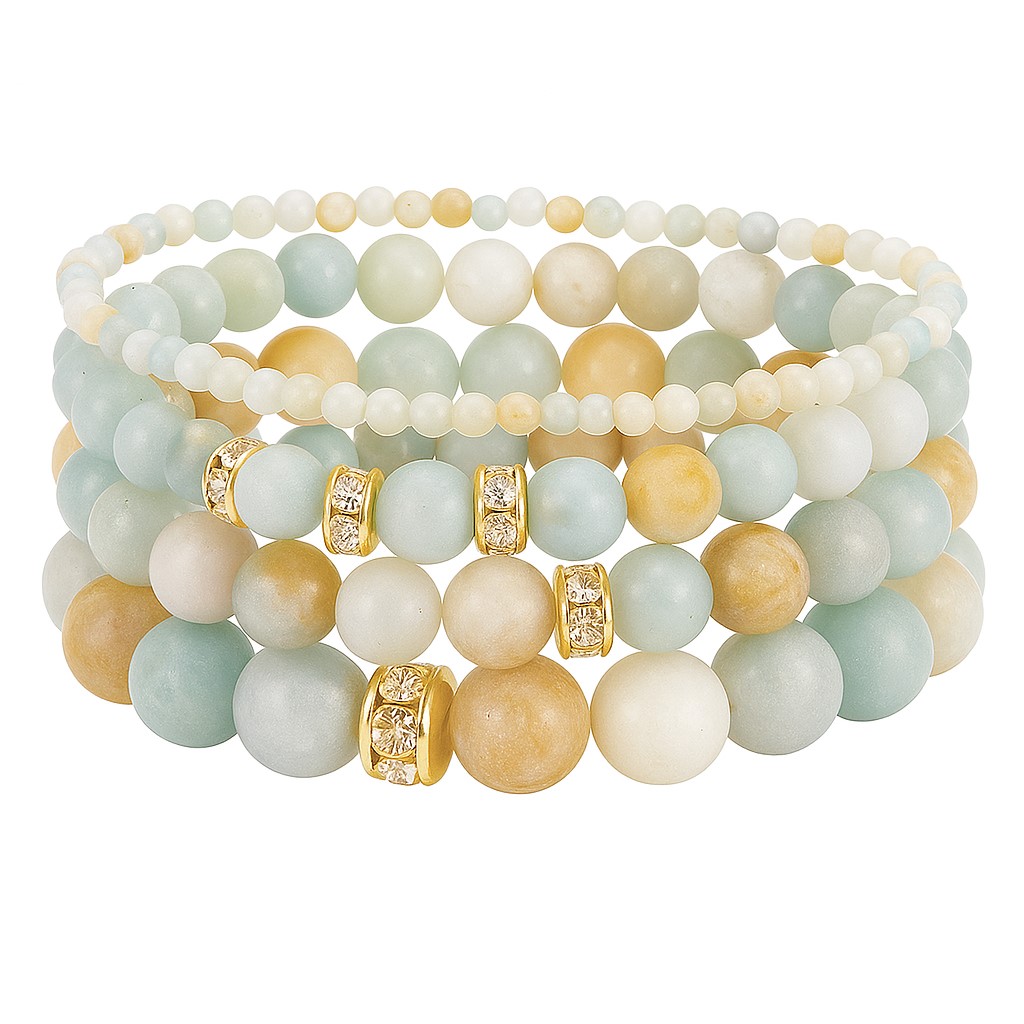 Inhalt: 1 Strang 4 mm Amazonit Perlen, 1 Strang 6 mm Amazonit Perlen, 1 Strang 8 mm Amazonit Perlen, elastisches Band, 20 silberfarbene 6 - 8 mm Strass Abstandperlen, 20 goldfarbenen 6 - 8 mm Strass Abstandsperlen, 10 Meter elastisches Band