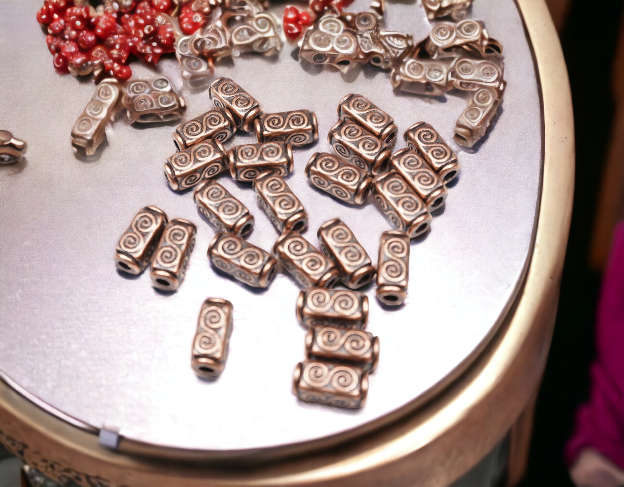 Produktinformationen "20 tibetische Metallperlen Spacer 5 mm Durchmesser 10,5 mm Länge rot kupferfarben"
