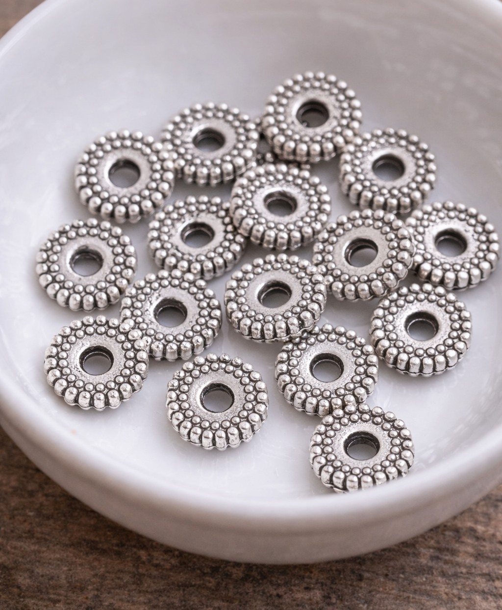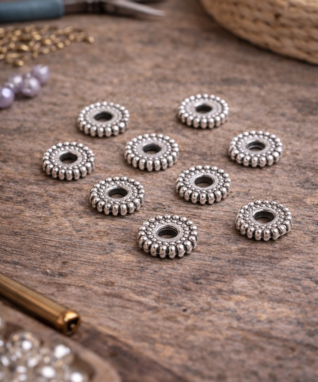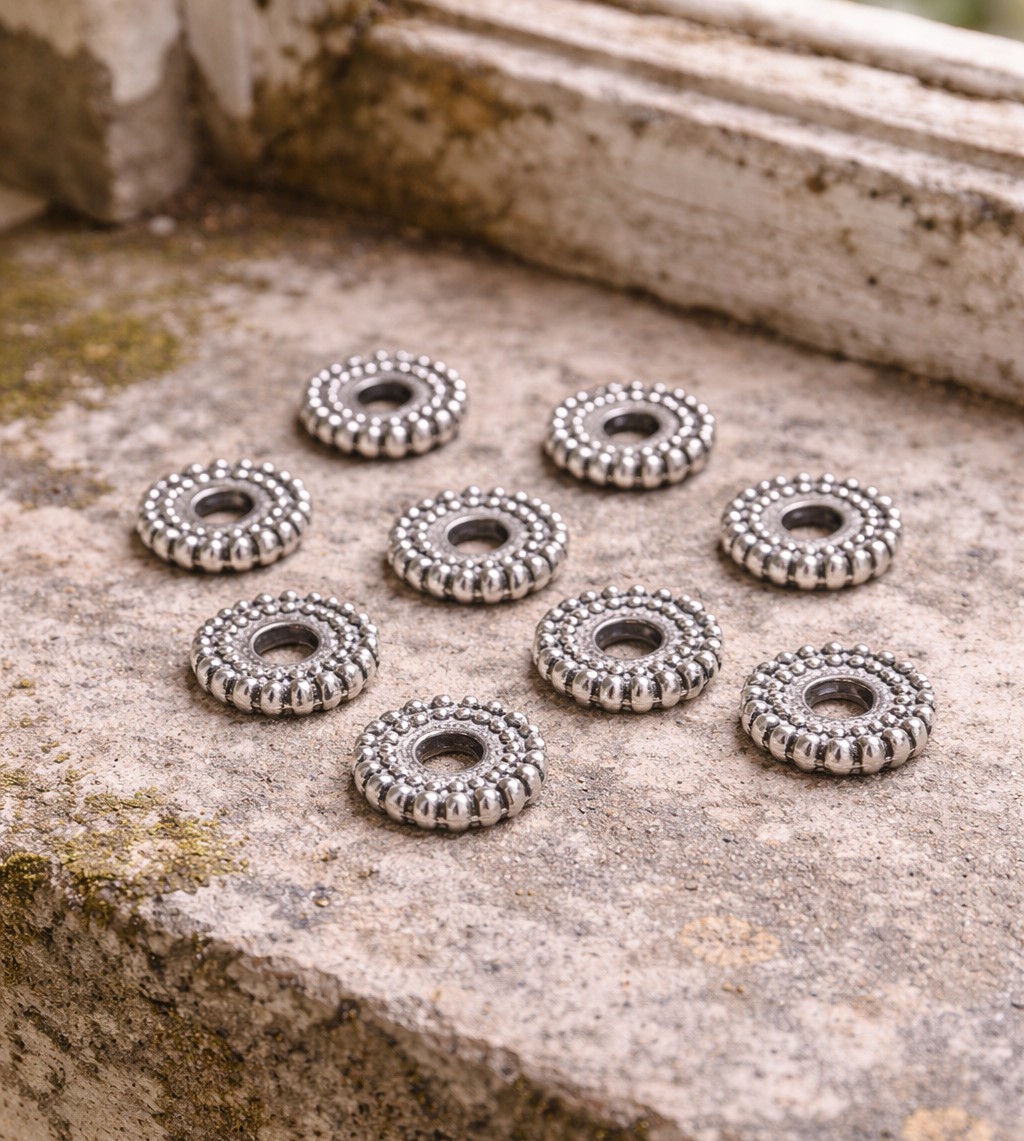 20 tibetische Metallperlen antik silberfarben 6 x 1,5 mm