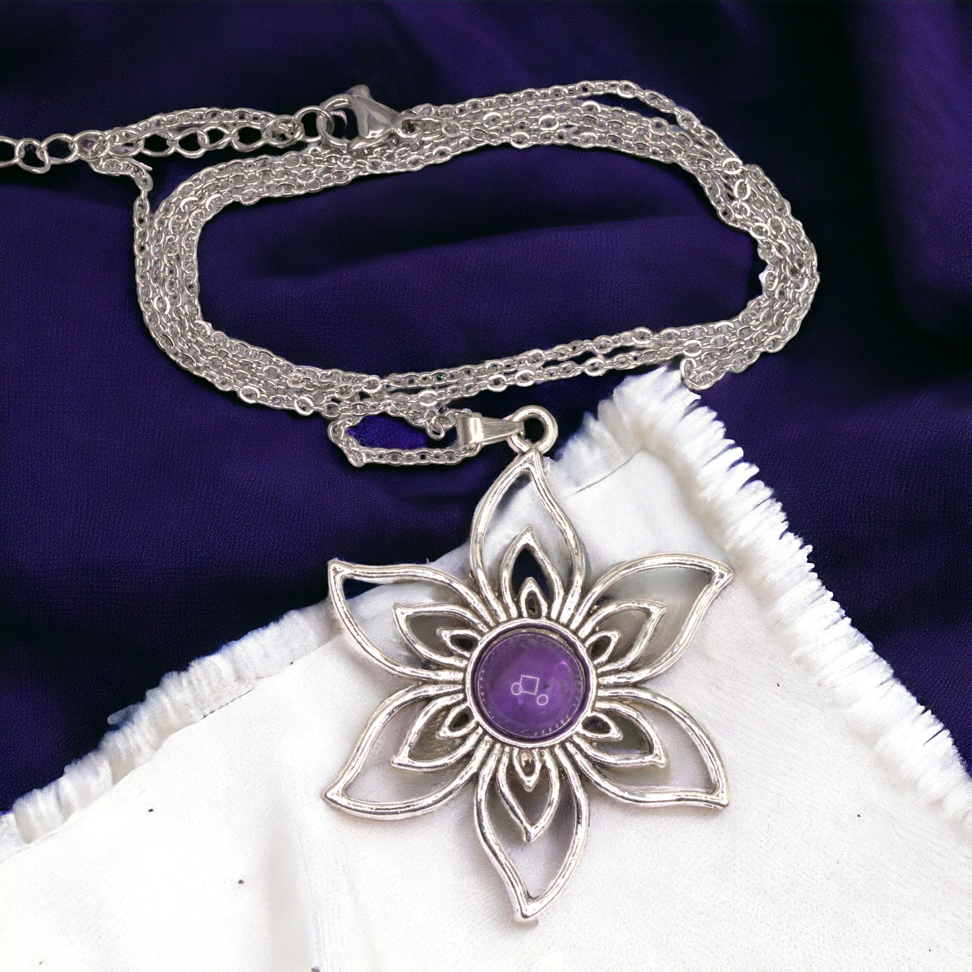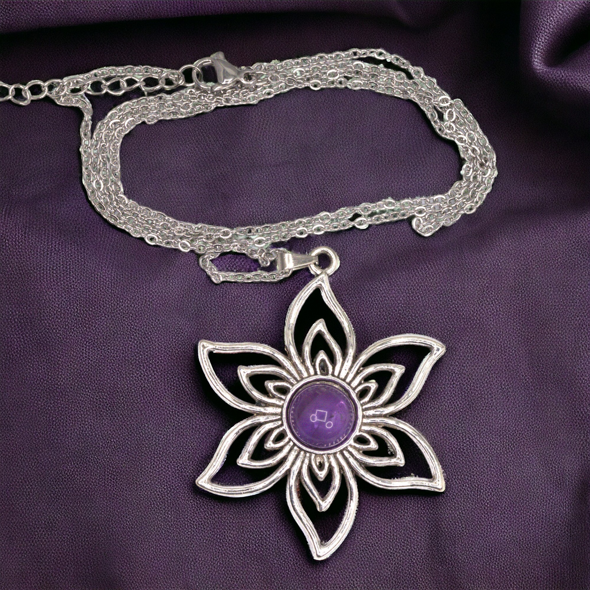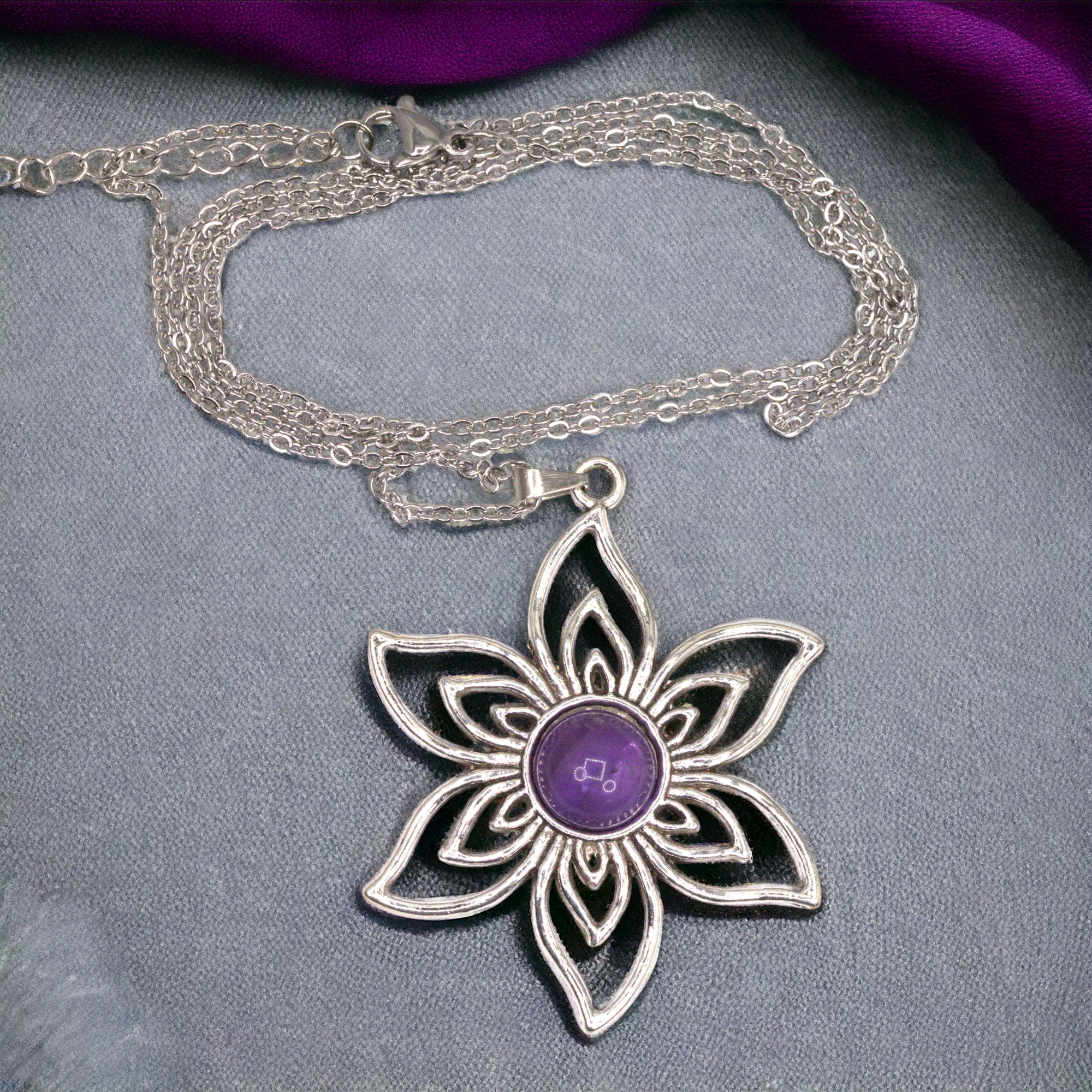 Das Set enthält: Edelstahlkette 60 cm Länge, Metall Blumenanhänger, Amethyst Cabochon, Anhängerschlaufe