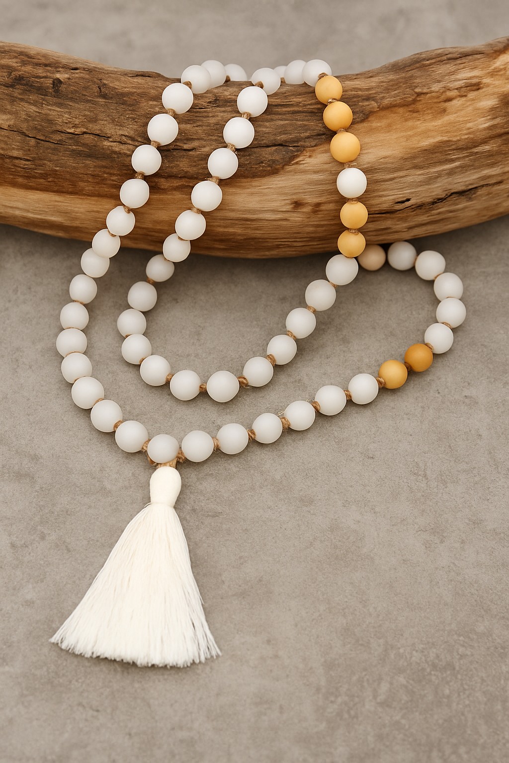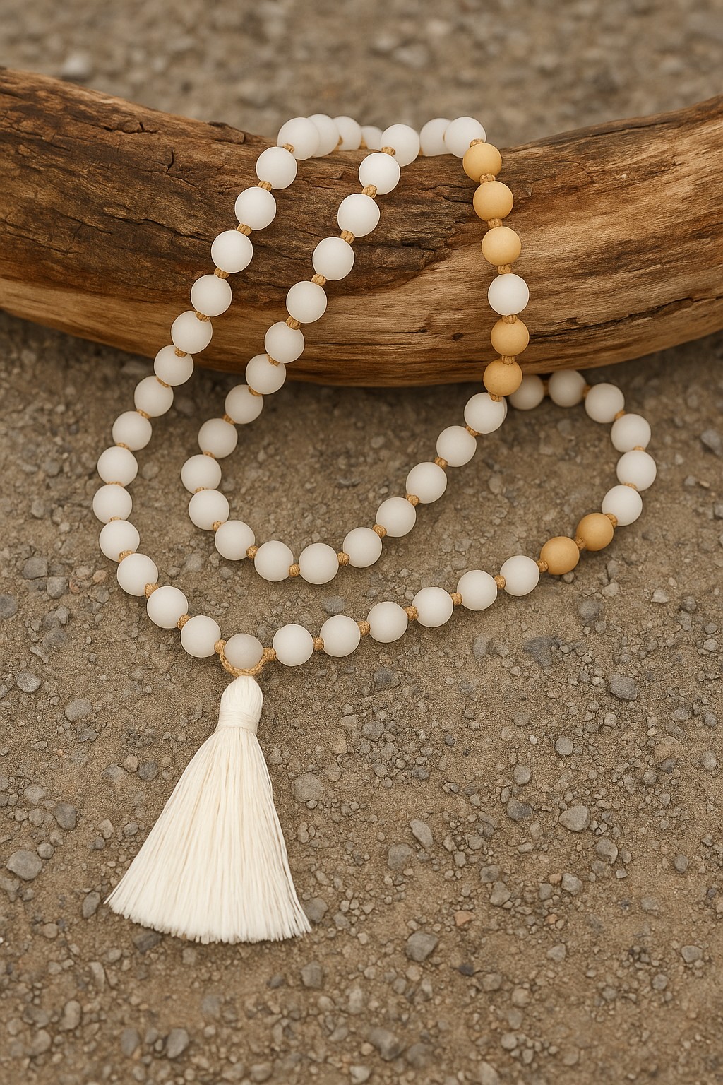 Das Set enthält 2 Stränge weiße matte 8 mm Achatperlen, einen Strang natürliche Holzperlen, gewachste Schnur und weiße Quaste