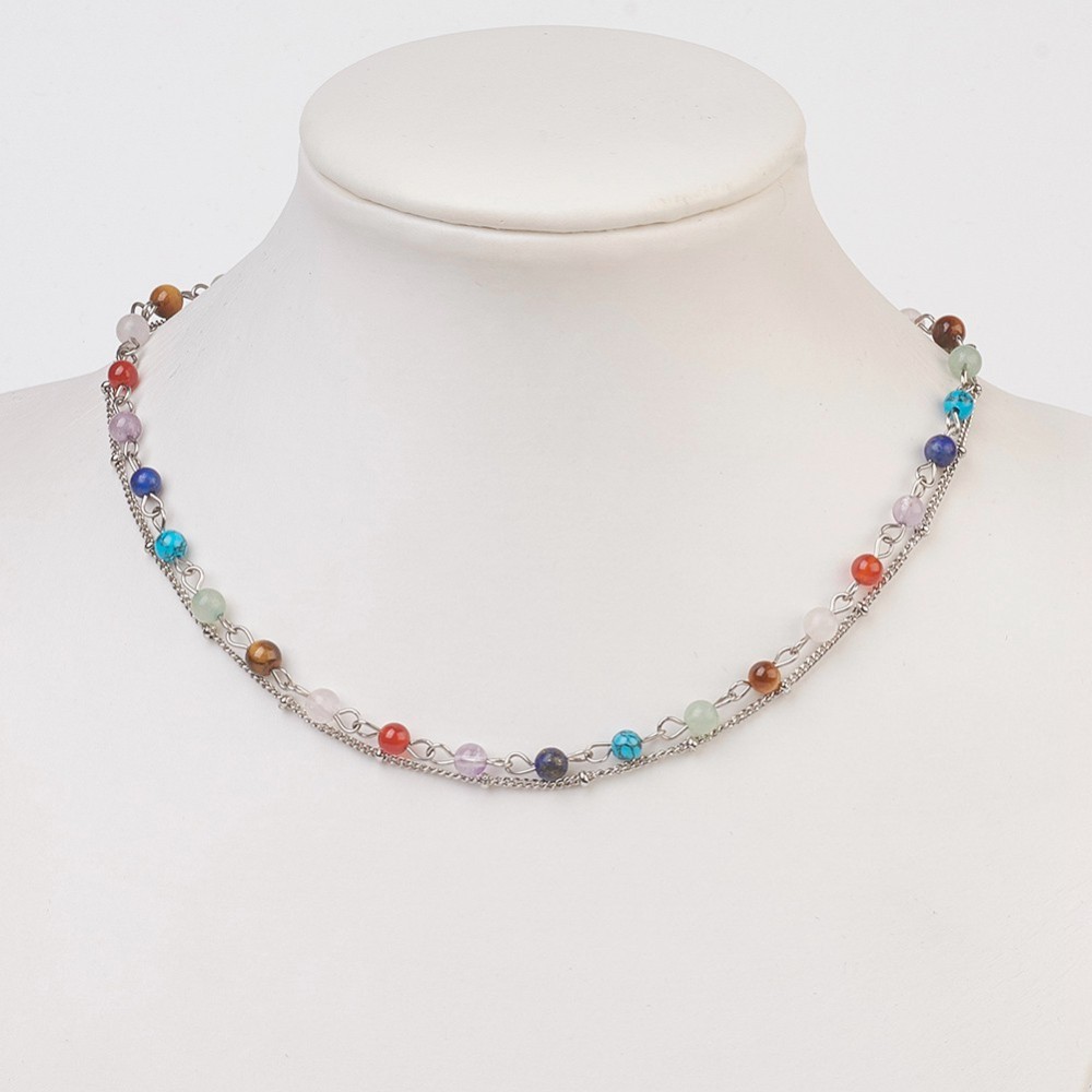 Doppelreihige Edelstahl Chakra Halskette mit natürlichen und synthetischen Perlen 32 cm Länge & 6 cm