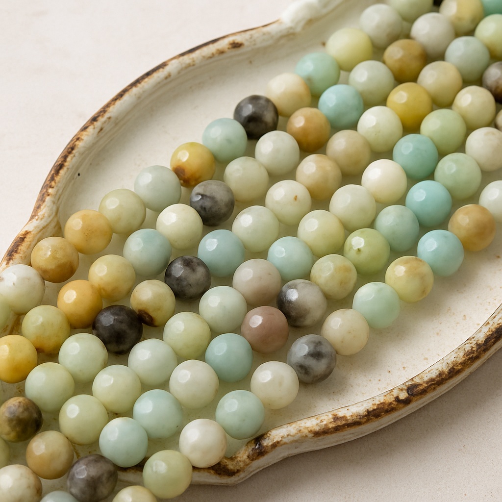 Durch den ganz feinen Schliff funkeln diese Amazonit Perlen im Licht. Der Strang hat viele helle naturfarbene und helltürkise Perlen, einige dunkel türkisfarbene Perlen und ca. 2 - 3 Perlen mit dunkleren mineralischen Einschlüssen