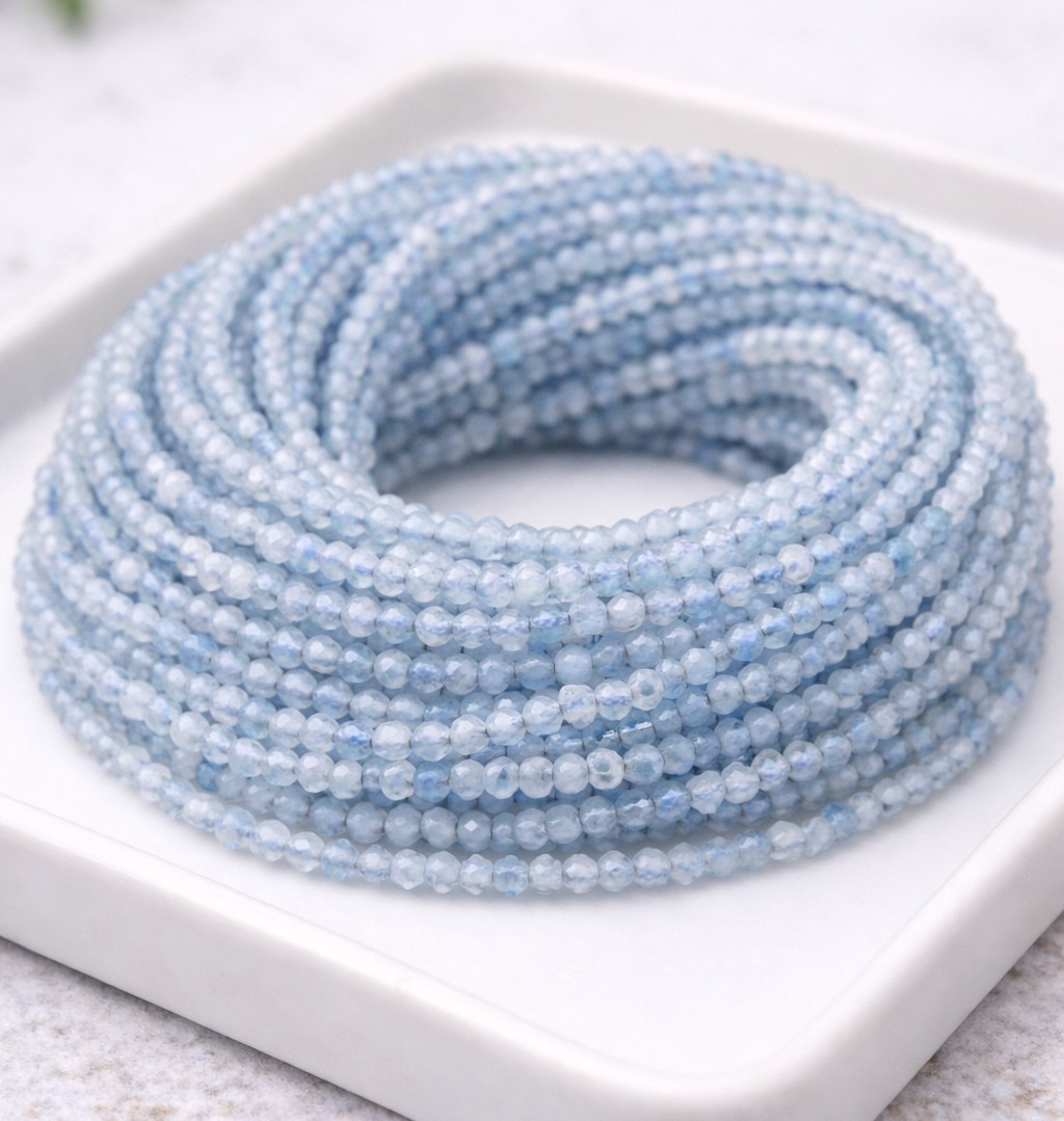 Natürlicher Aquamarin Perlenstrang 2 mm facettiert (ca. 210 Perlen / ca. 39,5 cm Länge)