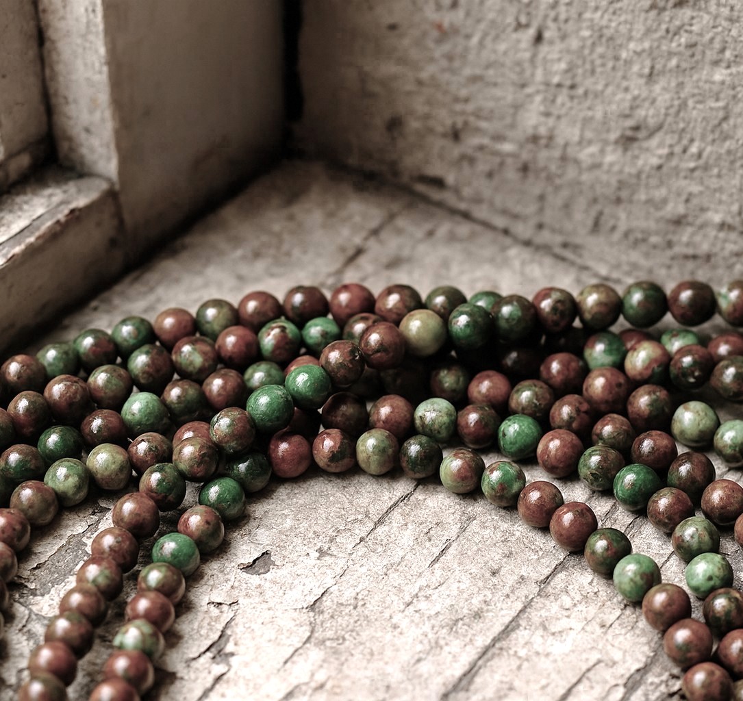 Dieser Strang hat einen besonders glatten Schliff und wirkt durch den grün türkisen Quarzeinschluß besonders edel