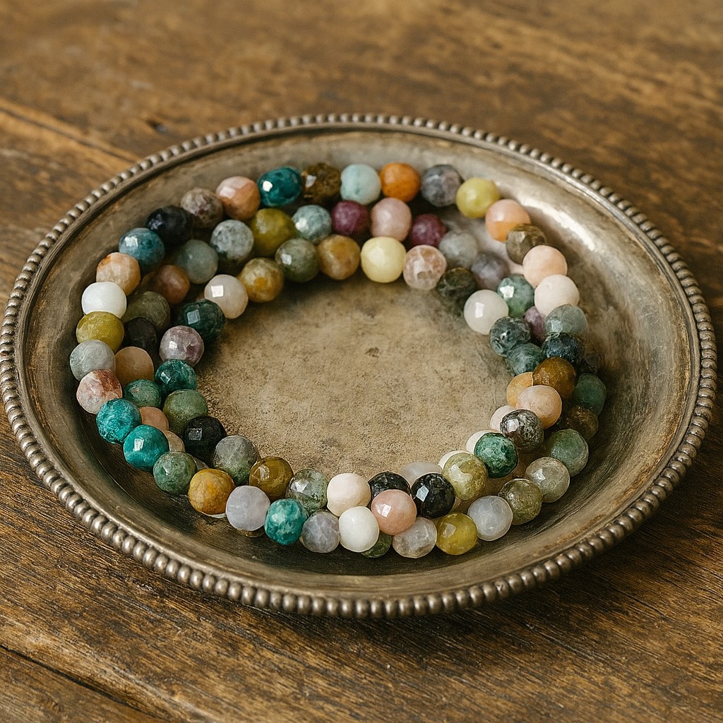Durch den feinen Schliff kommt das interessante Farbspektrum von weißer Jade, weißem Opalit, rotem Granat, rosa Rosenquarz, hellgrünem Labradorit, hellblauem Aquamarin bis hin zu braunem Tigerauge und schwarzem Achat besonders gut zur Geltung
