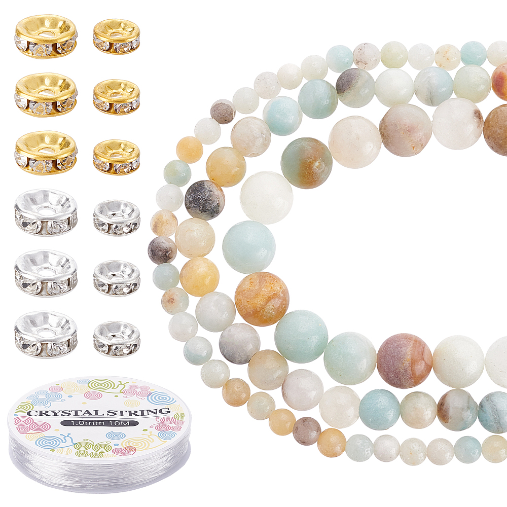 Inhalt: 1 Strang 4 mm Amazonit Perlen, 1 Strang 6 mm Amazonit Perlen, 1 Strang 8 mm Amazonit Perlen, elastisches Band, 20 silberfarbene 6 - 8 mm Strass Abstandperlen, 20 goldfarbenen 6 - 8 mm Strass Abstandsperlen, 10 Meter elastisches Band